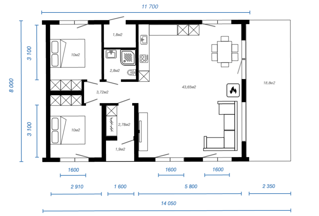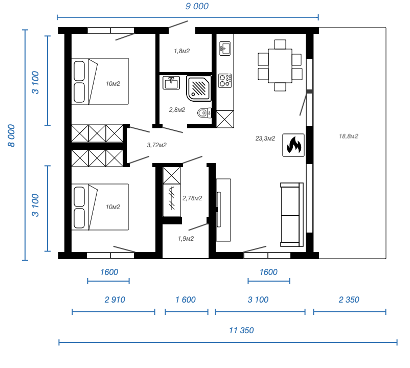 Планировка дома с 2 спальнями и увеличенной гостиной