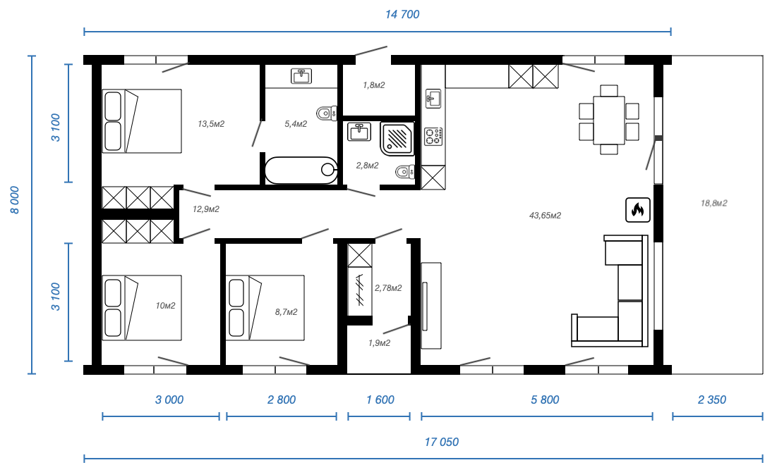 Планировка дома с 3 спальнями и увеличенной гостиной