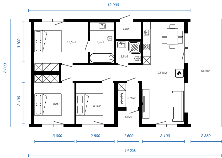 Планировка дома с 3 спальнями