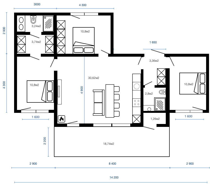 Планировка дома с 3 спальнями и 2 санузлами
